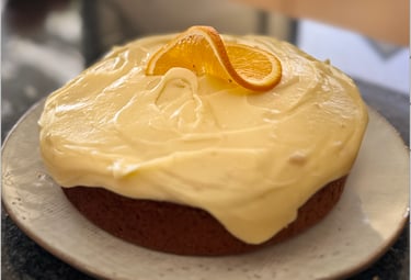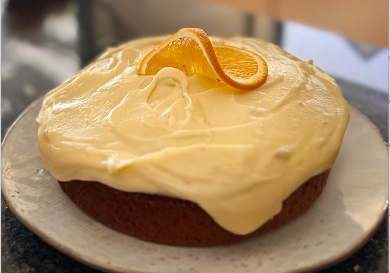 A simple orange cake made with fresh orange juice, buttermilk and a touch of brandy, finished with a soft cream cheese icing. An everyday cake, baked to be sliced thick and shared